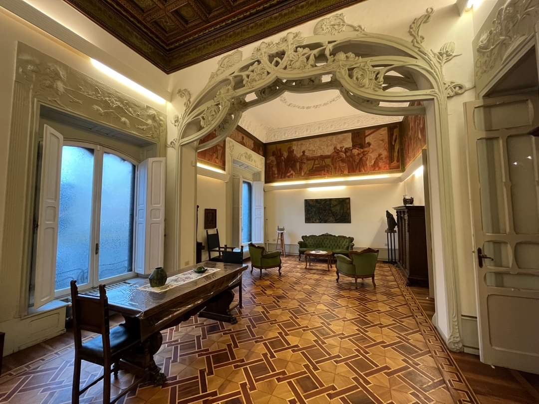Il salone è diviso in due da un elaborato arco scolpito a crisantemi intrecciati, una parte è decorata con soffitti a cassettoni, l'altra da un affresco raffigurante i grandi scultori della storia dell'arte: Donatello, Bernini e Fidia. In origine era presente un grande camino scolpito da Ximenes, con fanciulle di gusto floreale.