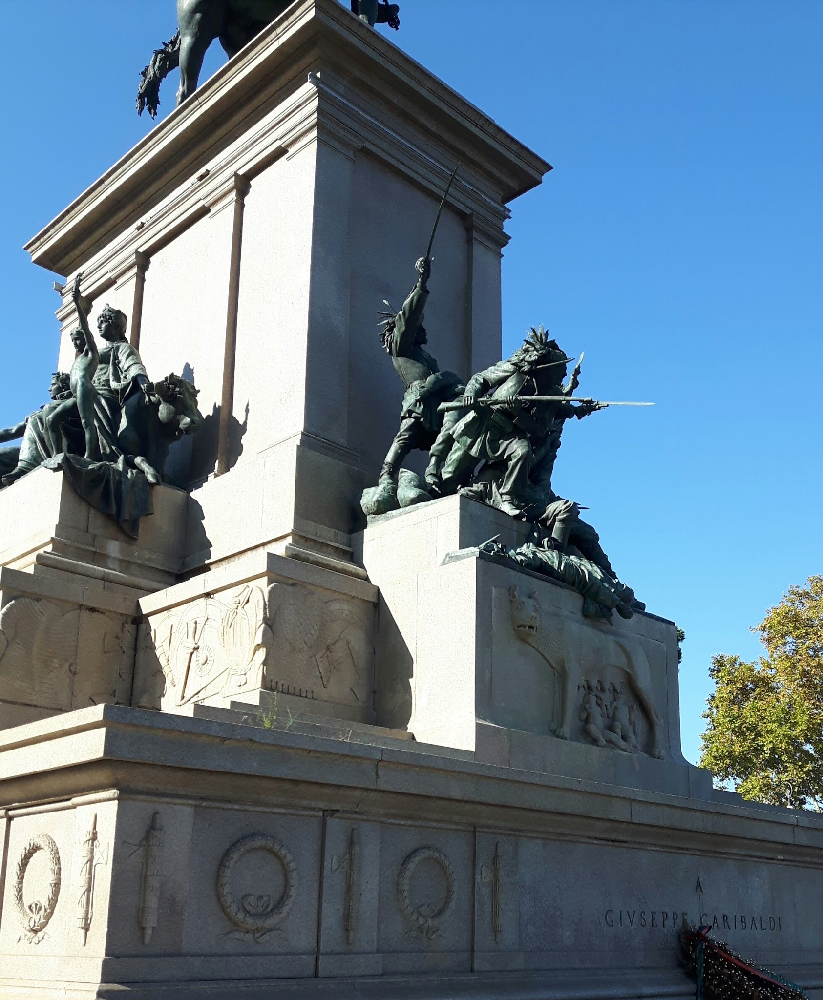 Il grande basamento rettangolare, in granito di Baveno, è decorato da fregi con armi e armature, sui quattro avancorpi, sono presenti altrettanti gruppi bronzei con azioni garibaldine e figure allegoriche: sulla fronte i Bersaglieri di Luciano Manara all'assalto per la difesa di Roma, sul retro i combattenti di Calatafimi. Ai lati della base è presente la scritta ROMA O MORTE.